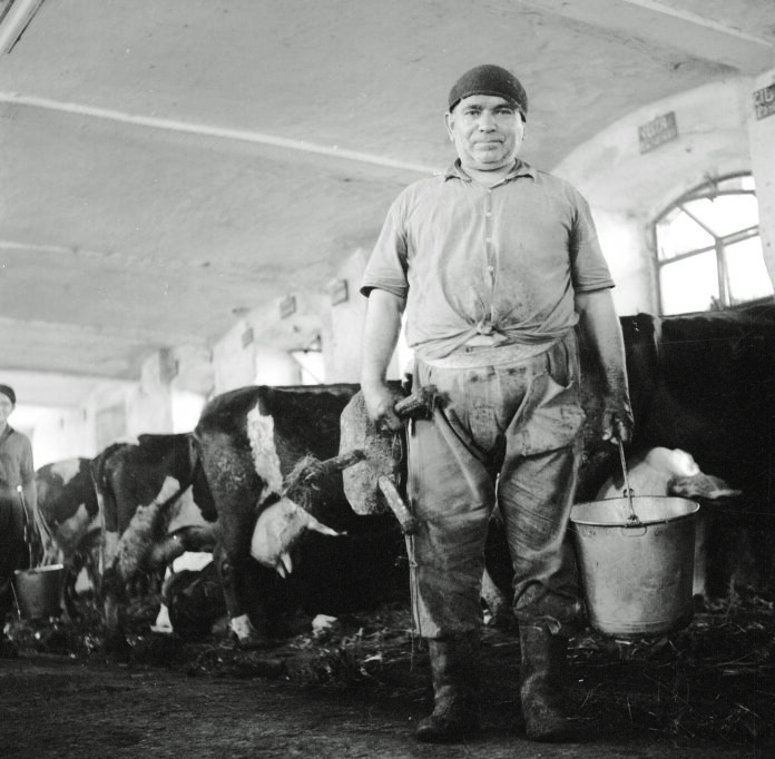 Piero Azzali, mungitore, nella stalla della cascina Balestrieri a Vho (1967, foto di Giuseppe Morandi)