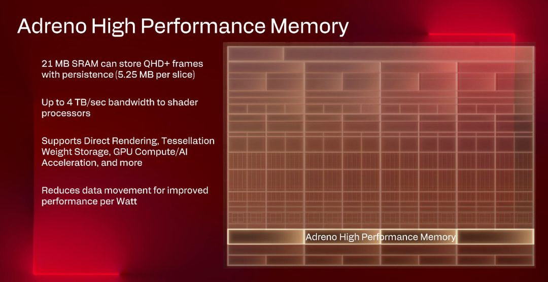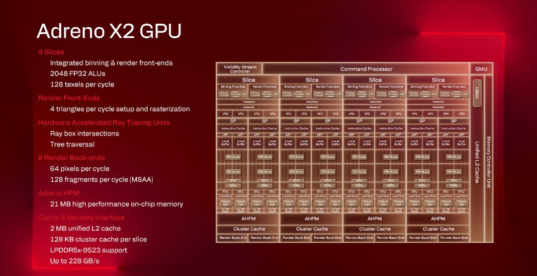 La GPU Adreno X2 utilizza la stessa architettura slice-based vista anche su Snapdragon 8 Elite, dove ogni “slice” è un’unità di rendering completa e indipendente. Potete pensare agli slice come stazioni di lavoro autonome: più ne avete, più lavoro potete fare in parallelo.