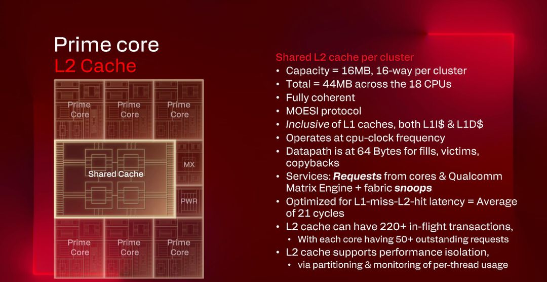 Per permettere a tutti i cluster di accedere agli stessi dati senza doverli spostare dalla RAM Qualcomm ha implementato una cache condivisa da 9 MB con banda aumentata del 70% rispetto a quella del primo X Elite:  cluster CPU e cache sono uniti da una Custom Spine Coherent Fabric che garantisce interconnessione a larga banda con latenza minima.