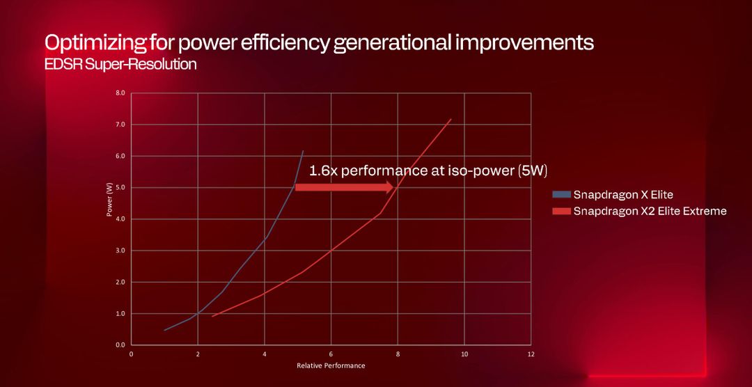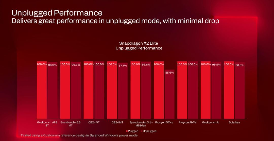 Nonostante l’aumento netto di potenza, Qualcomm dichiara miglioramenti significativi nell’autonomia complessiva. Secondo l’azienda c’è stata una riduzione superiore al 10% nel consumo del chip su scenari multipli come web browsing, Office, streaming video e videochiamate su Teams e Zoom.