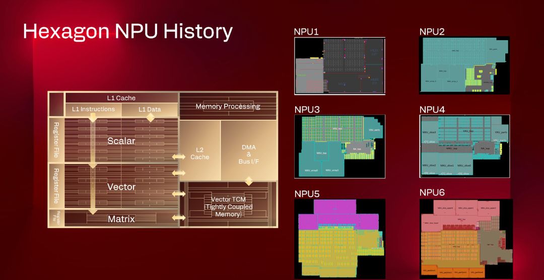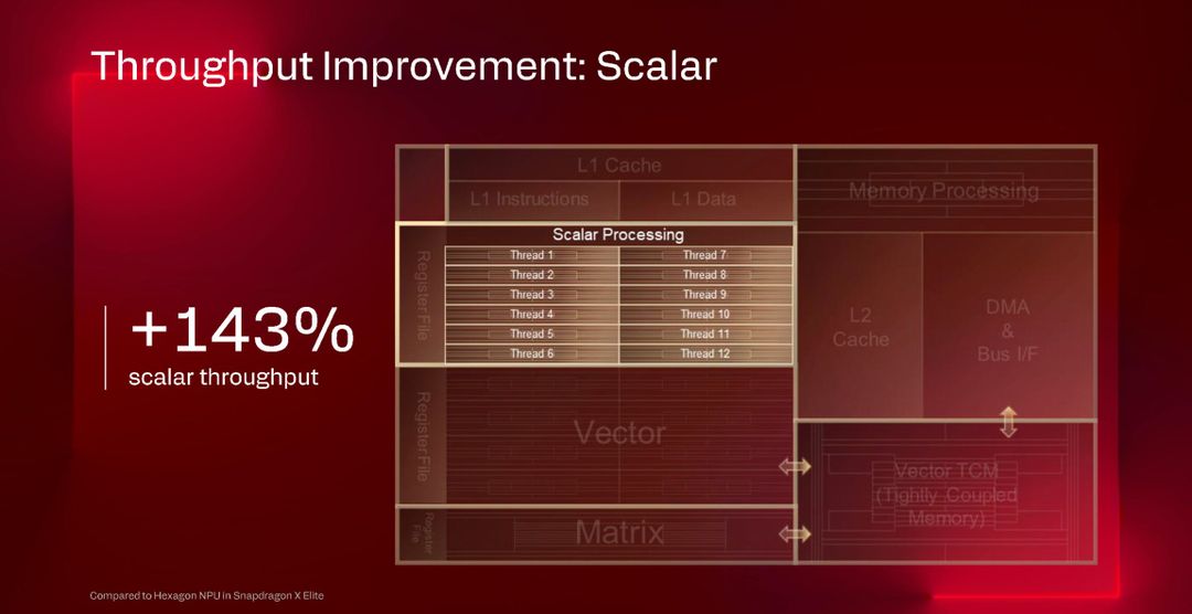Quando la CPU lavora a 5 GHz il Matrix Engine può eseguire letture e scritture a 64 byte con la cache L2, fornendo un’enorme larghezza di banda per le operazioni matriciali che caratterizzano i moderni modelli di intelligenza artificiale. Gli acceleratori matriciali (SME) sono presenti anche nell’architettura ARM classica ma Qualcomm, come Apple, ha sviluppato una sua soluzione proprietaria.