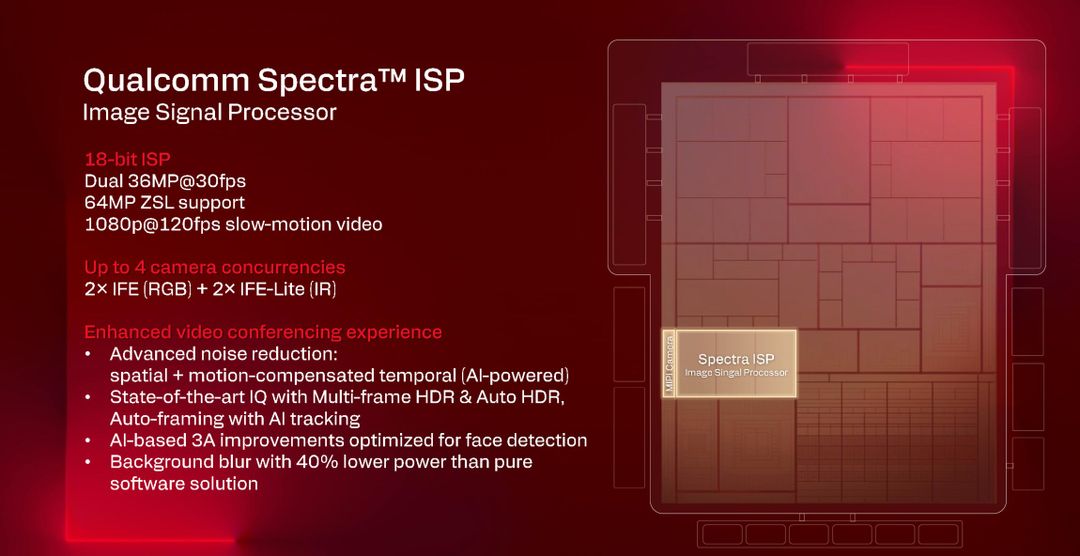 Sulla nuova generazione è stata quindi integrata una nuova pipeline di riduzione del rumore AI, che combina analisi spaziale e temporale usando algoritmi che compensano i movimenti tra i frame oltre al multi-frame HDR, utile per compensare il controluce dovuto a finestre dietro la schiena. Il bokeh gestito dallo Snapdragon, secondo Qualcomm, consuma il 40% in meno grazie alla collaborazione tra ISP e micro-NPU del Sensing Hub.