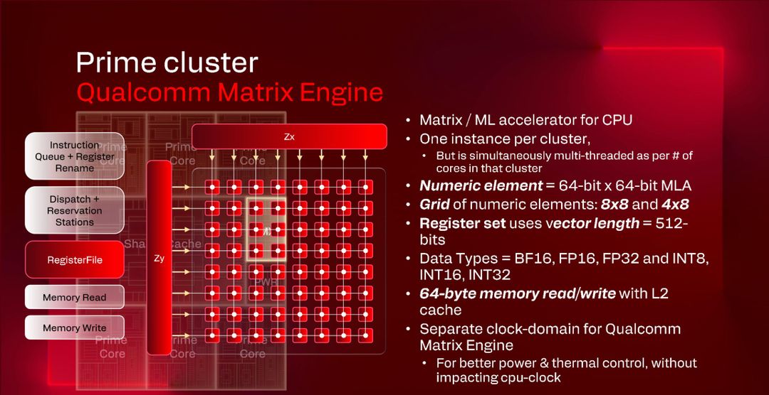A fianco di queste unità è presente, per ogni cluster, un Qualcomm Matrix Engine, un acceleratore AI dedicato che lavora fianco a fianco con la CPU. È ottimizzato specificamente per le moltiplicazioni di matrici, che sono il cuore di tutti gli algoritmi di machine learning: può lavorare con elementi numerici a 64 bit, griglie 8×8, registri vettoriali da 512 bit e vari formati numerici tra cui BF16, FP16, FP32, INT8, INT16 e INT32.