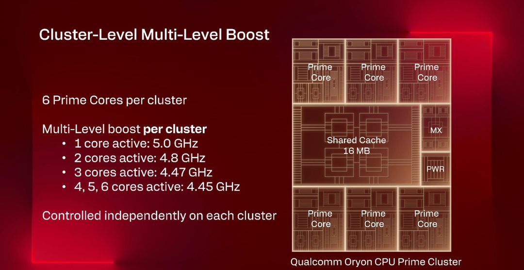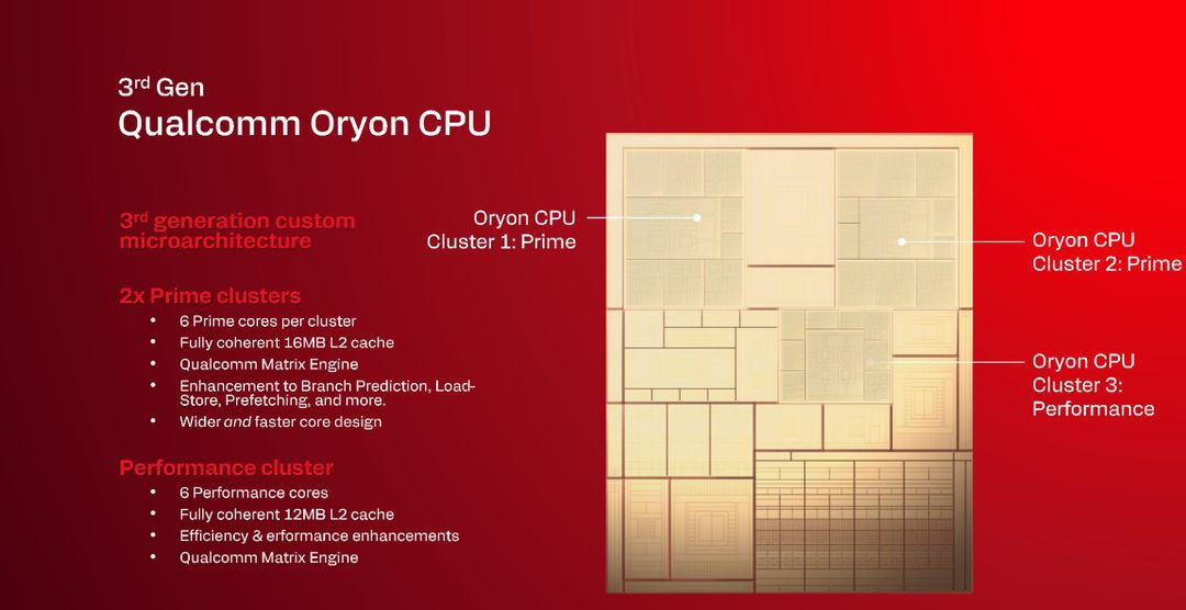Qualcomm, come abbiamo visto, ha optato per una configurazione inusuale con 18 core totali, ma non tutti i core sono uguali. L’azienda ha implementato infatti cluster distinti, ciascuno ottimizzato per uno scopo specifico.