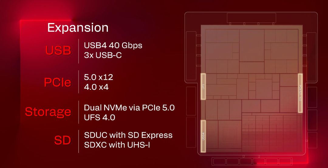 Lato ingressi e uscite troviamo un controller USB4 a 40 Gbps (fino a 3 porte), PCIe 5.0 (12 lane) e PCIe 4.0 (4 lane), un doppio controller NVMe PCIe 5.0 che può supportare anche un RAID oltre alla possibilità, per i prodotti meno costosi, di usare storage UFS 4.0. C’è anche il controller per lo slot SD Express – SDXC.