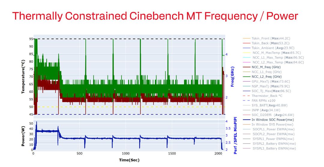 Ancora più interessante è vedere come si comportano le frequenze sotto questo carico prolungato. I cluster Prime mantengono una media di circa 2,8 GHz, con sporadici boost fino a 3,5 GHz, mentre il cluster Performance opera intorno ai 2,0 GHz. È un comportamento molto stabile: nonostante il calore accumulato non si osservano crolli drammatici, ma un controllo preciso della potenza. Il consumo medio del SoC è di circa 25 watt, con picchi brevi fino a 40 watt durante le fasi di boost.