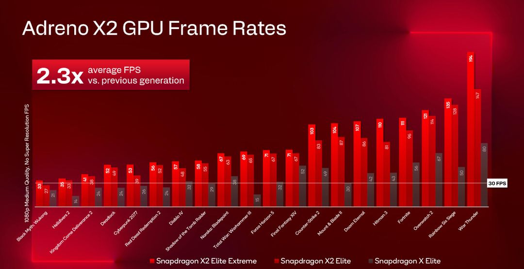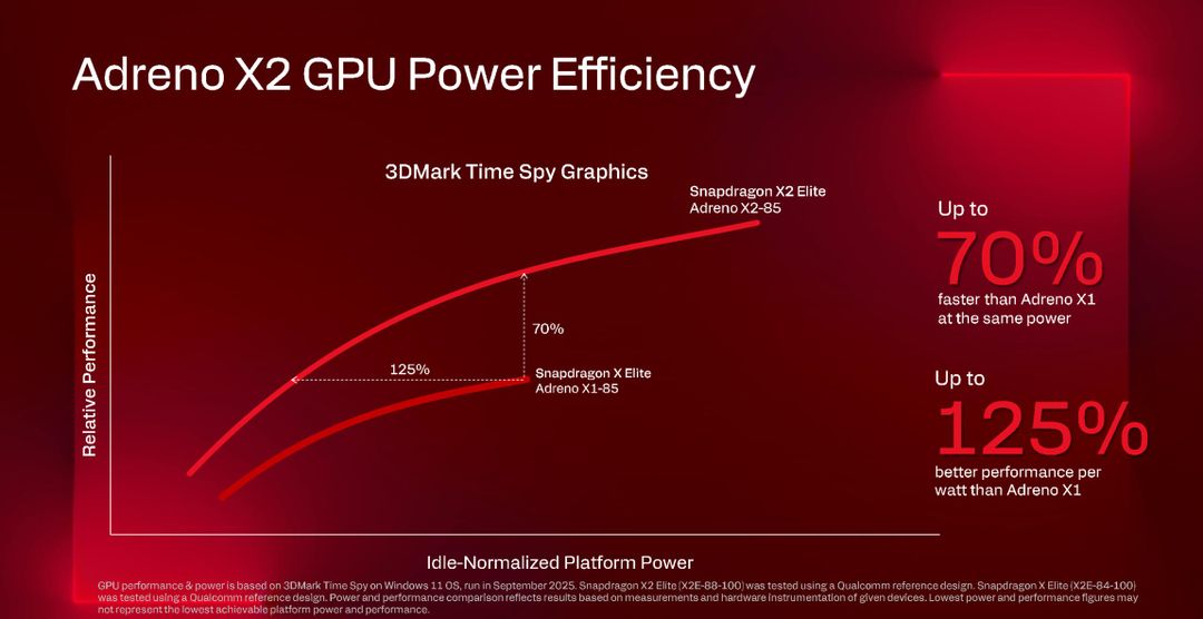Qualcomm ci spiega che a 1.85 GHz le 2048 ALU forniscono circa 7.6 TFLOPS di potenza computazionale: per dare dei riferimenti utili la PlayStation 5 offre circa 10 TFLOPS, la Xbox Series S circa 4 TFLOPS, la Steam Deck circa 1.6 TFLOPS e l’Adreno X1 della generazione precedente circa 3.3 TFLOPS. Ricordiamo che ci troviamo davanti ad una piattaforma che non raggiunge i consumi di una console, consuma meno della metà.