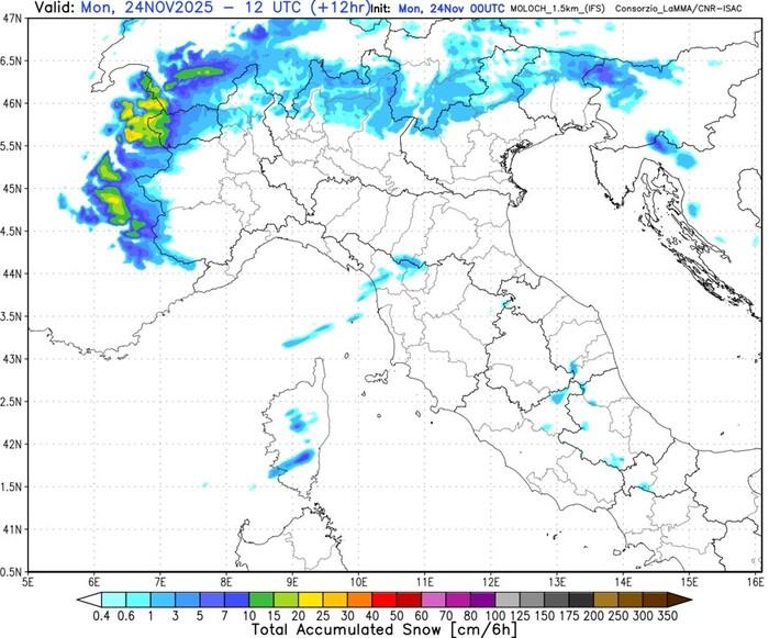 Le precipitazioni nevose previste per Lunedì 24 Novembre