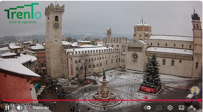 Attualmente si segnalano nevicate a Bolzano, sulle Dolomiti e in Trentino, con fiocchi anche in città a Trento (come possiamo vedere dall’immagine della webcam in diretta qui sotto).