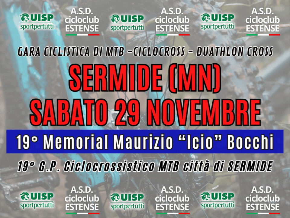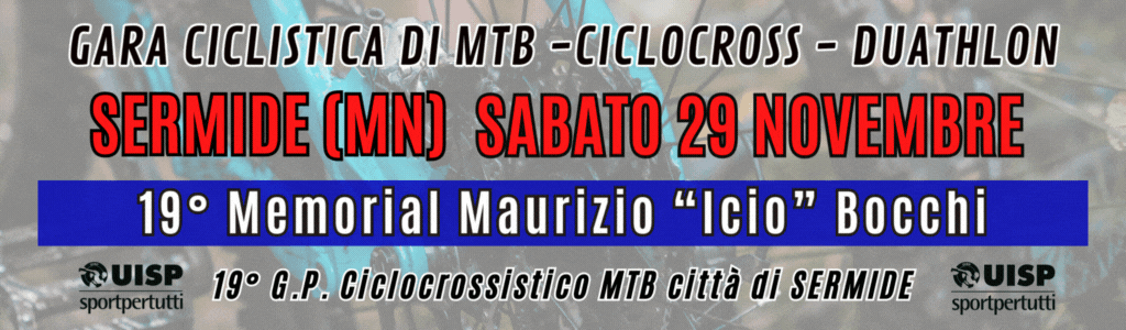 29/11 a Sermide (MN): “19° G.P. Ciclocrossistico e MTB Città di Sermide” “19° Memorial Maurizio ICIO Bocchi”. Gara Mtb, Ciclocross e Duathlon Cross aperta agli Enti convenzionati e Bike Card. Ritrovo ore 12.00 c/o Stadio Comunale Piazzale Marco Banzi. Partenza ore 13.30 Ciclocross a seguire Duathlon Cross, ore 14.30 Mtb. Percorso di km 28. Org. Asd Cicloclub Estense. Info 3389906284. [LOCANDINA]