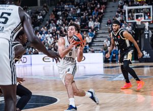 Nella foto Virtus : Alessandro Pajola, capitano delle Vnere, qui in maglia bianca in trasferta di Eurolega