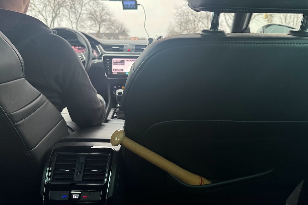 Questa volta tocca a “Max”, che tiene una mazza di legno infilata nella tasca del sedile della Skoda, a portata della sua mano destra. È la risposta pratica a un’ansia elementare: Max vuole avere una potenza di fuoco superiore a un possibile nemico.