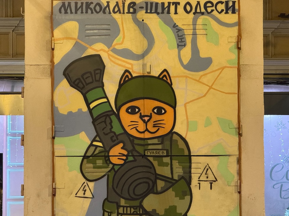 Sui muri di Odessa capita spesso di vedere i gatti disegnati dall’artista Ihor Matroskin. Questo, a tema patriottico, imbraccia un missile controcarro Javelin, che nel 2022 era l’arma simbolo degli aiuti americani all’Ucraina. Sembra passato un secolo. La scritta dice “Mykolaiv scudo di Odessa”, perché a quel tempo i soldati russi tentavano di arrivare in città passando appunto per Mykolaiv. Furono respinti. (Daniele Raineri, il Post)