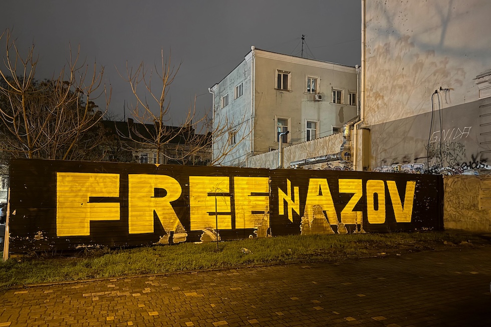 Un murale che chiede la liberazione dei prigionieri del gruppo di estrema destra Azov, catturati nel 2022 a Mariupol, durante la distruzione della città da parte dei russi. Il gruppo Azov non esiste più, i suoi uomini fanno parte di unità regolari dell’esercito. (Daniele Raineri, il Post)