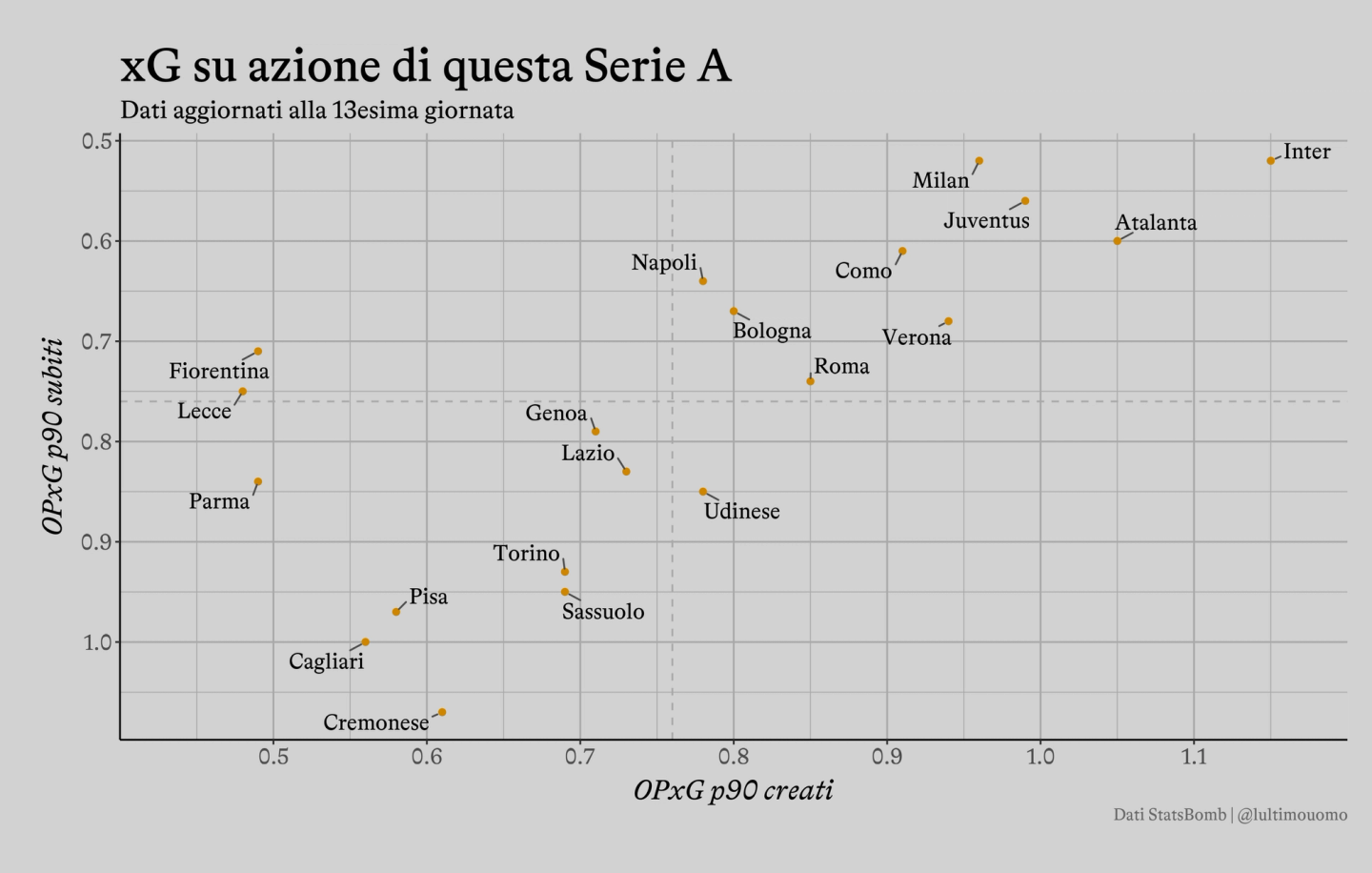 La media del campionato (0.76, che è ovviamente la stessa sia per quelli creati che per quelli subiti) ci permette di dividere il grafico in quattro quadranti. In quello in alto a destra ci sono le migliori squadre della Serie A, ovvero quelle che su azione creano tanto e subiscono poco. Come potete vedere ci sono tutte le squadre che vi aspettate, e poi il Verona.