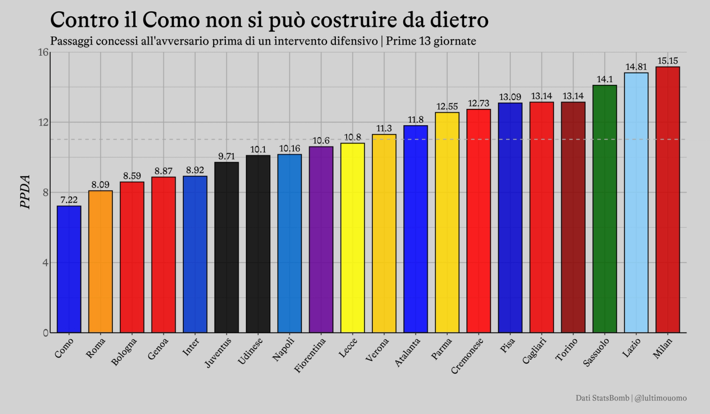 Per chi segue la Serie A da qualche anno sarà forse una sorpresa: quest’anno il Bologna per ora non è primo, ma solo terzo. Davanti alla squadra di Vincenzo Italiano vediamo la Roma di Gian Piero Gasperini (anche questa non una grande notizia) e soprattutto il Como di Cesc Fabregas, che già la scorsa stagione si era distinto per un assetto difensivo molto aggressivo.