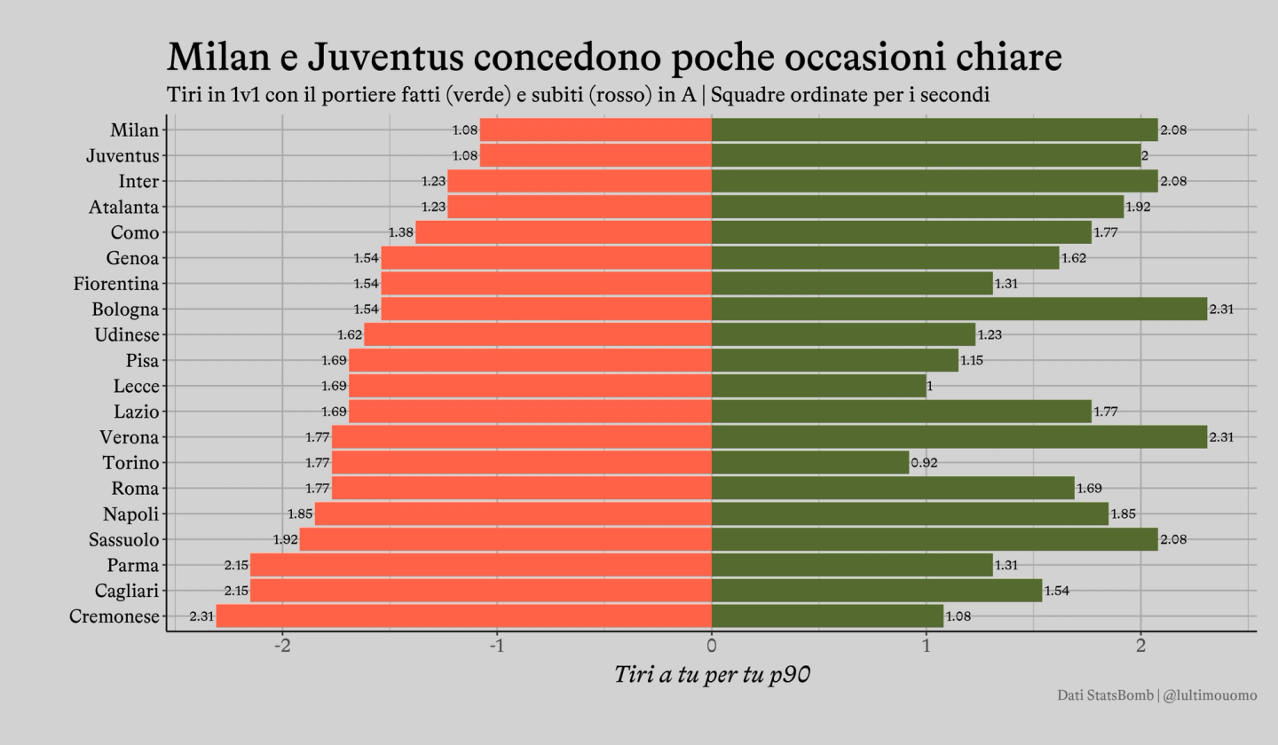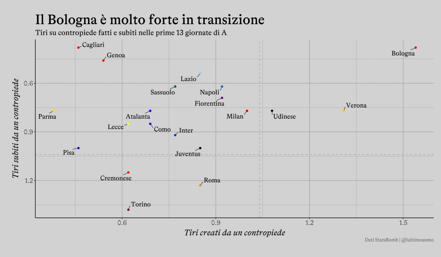 Dal lato dei tiri fatti, invece, Bologna e Verona (ancora) restano delle grandi creatrici di occasioni nitide: è lecito pensare che molte di queste arrivino da azioni rapide in ripartenza, come visto nel grafico di prima.