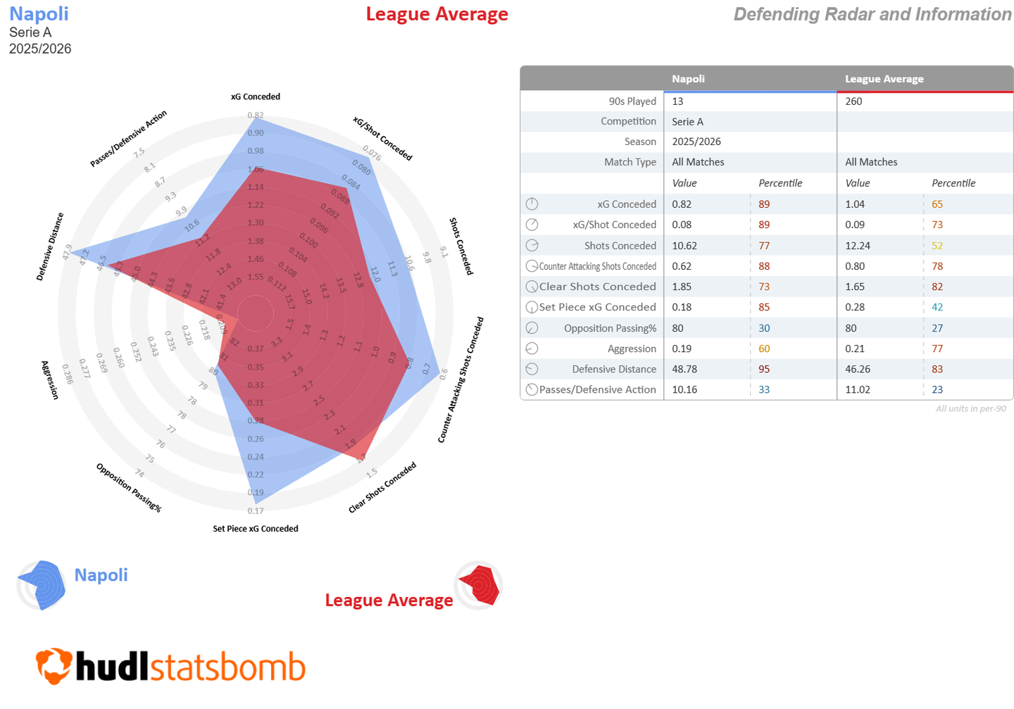 Nel grafico si possono confrontare diversi aspetti difensivi della squadra di Conte (in azzurro) con quelli medi del campionato (in rosso). Come sottolineato in precedenza, il Napoli rimane una squadra capace di non subire troppo in nessuna situazione particolare, forti di una stabilità diffusa che ha permesso di superare alcuni infortuni nel reparto di questo inizio di stagione.