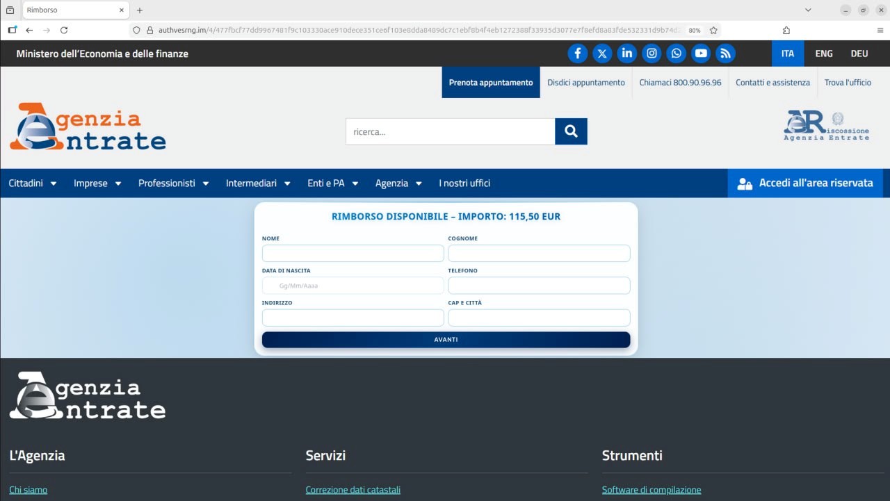 Cliccando si viene indirizzati verso una pagina fraudolenta che, simulando il portale ufficiale del Fisco, prospetta il riconoscimento di una somma pari a 155,50 euro, invitando il contribuente a compilare un modulo con i propri dati anagrafici e quelli bancari.