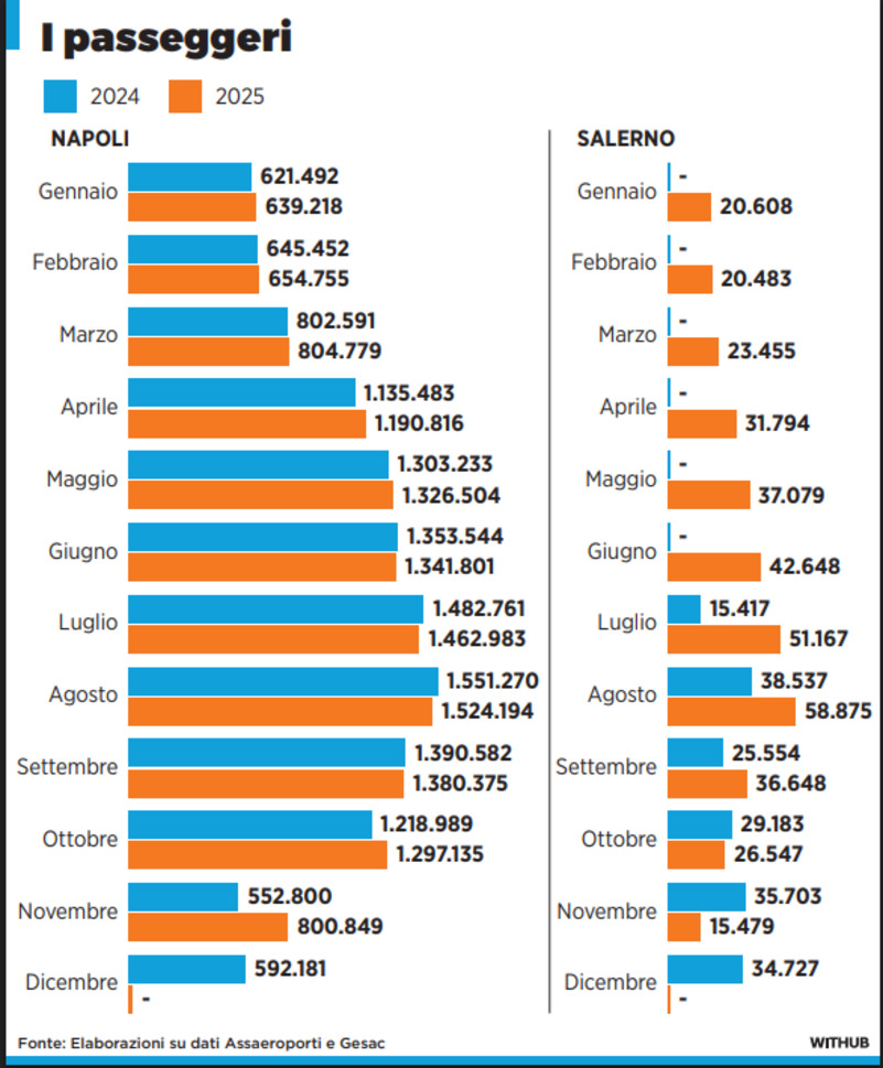 Se il 2025 chiuderà con il nuovo record molto è legato da un lato alla sempre maggiore articolazione del network dei collegamenti diretti che nell’estate scorse ha toccato quota 120, tra questi tutti i principali hub mondiali da dove, in pratica, si è connessi con ogni destinazione sul pianeta. Network che – e questo è anche la propulsione ai dati dell’autunno – al netto delle destinazioni marine è rimasto sostanzialmente in piedi anche dopo settembre. In questo quadro particolarmente importante è il contributo dei sette voli del Nord America (New York Jfk, i due per New York Newark, Filadelfia, Atlanta, Chicago e Toronto). I voli aggiunti nell’estate 2025 hanno portato i passeggeri a quota 379mila (erano 215mila nell’estate del 2024) con una crescita del 77% e grande soddisfazione di tutte le compagnie (American Airlines, Delta, United e Air Canada) che li hanno operati e li programmano anche nell’estate 2026, stagione che sarà decisiva per dare corpo al progetto di rendere almeno un volo stabile per tutto l’anno. Progetto che attende segnali dal mondo dell’ospitalità di alto livello per le aperture nelle costiere, in particolare, l’amalfitana per tutto l’anno. Segnali attesi e non arrivati a Salerno, dove la mancata propulsione del Cilento, ritardi nelle infrastrutture e scarso interesse nel mercato locale stanno limitando lo sviluppo dello scalo di Pontecagnano che non solo ha una magra stagione invernale, ma già delinea una serie di dinieghi per quella estiva. Intanto, dopo il -9% di passeggeri a ottobre, si registra un meno 56,6% a novembre da 35.703 a 15.479. Una luce arancione, se non rossa, che chiama all’azione, più che alle parole e ai post, in primo luogo la comunità locale.