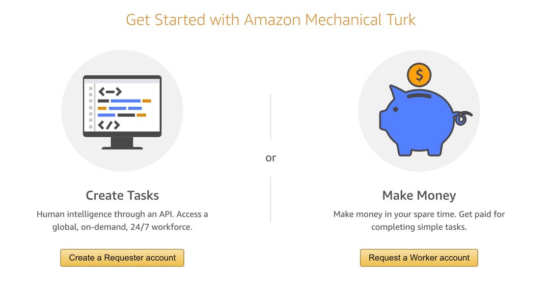 Questa soluzione esiste ancora e al tempo dell’IA fa sorridere: è un servizio internet di crowdsourcing che permette ad un committente di coordinare persone in tutto il mondo per eseguire compiti che i computer, a oggi, non sono in grado di fare. Con Mechanical Turk i requester possono pubblicare obiettivi da completare e i Turker, quindi persone da tutto il mondo con un computer, possono ricercare tra gli obiettivi esistenti e completarli in cambio di un pagamento deciso dal requester.