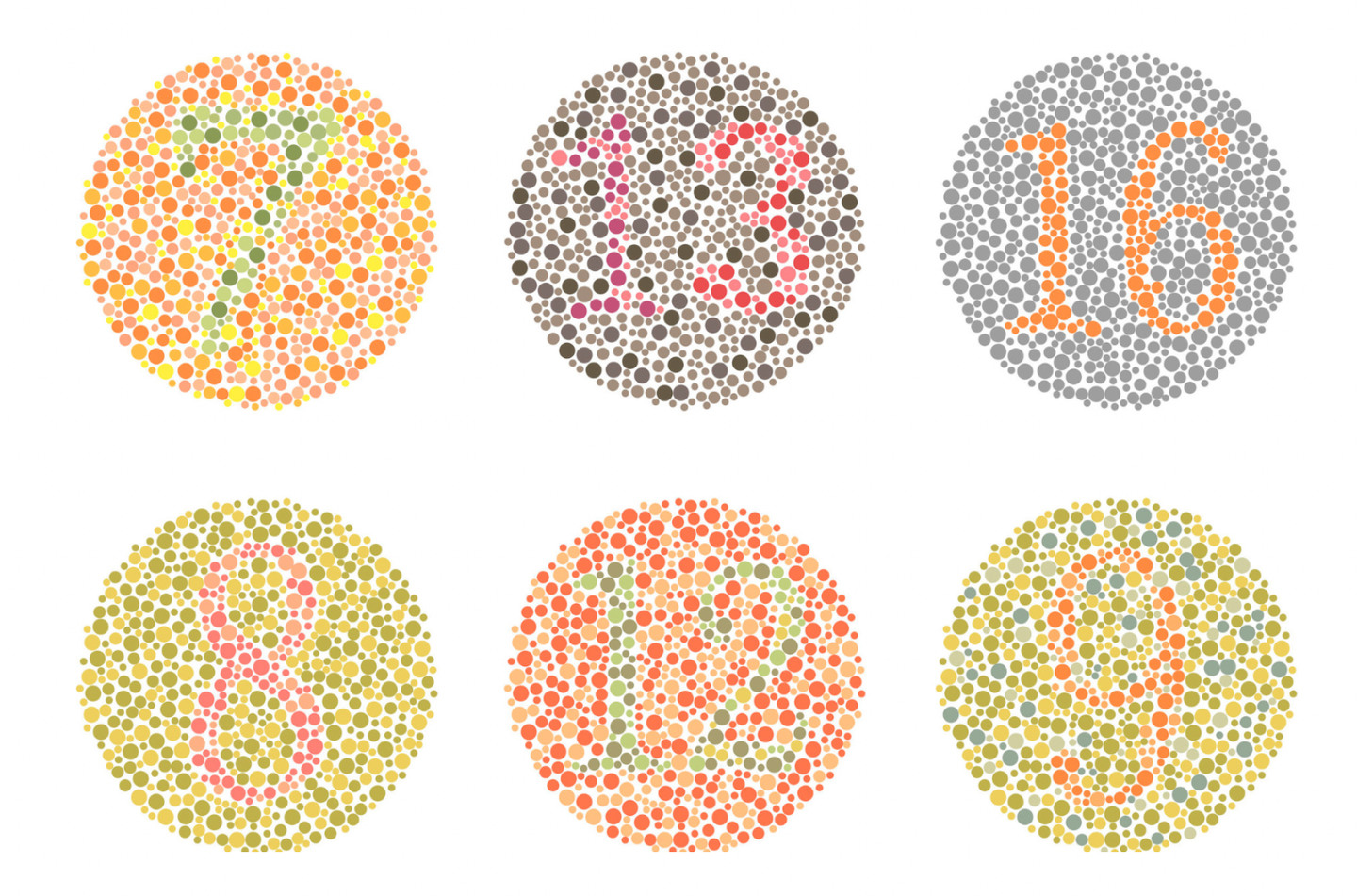 Qui sopra potete vedere alcuni esempi di queste tavole. Oltre a fare un rapido controllo della vostra percezione cromatica, potete intuire dove sto andando a parare. Un pallone arancione che scorre su un prato verde è evidentemente un problema per chi ha questa caratteristica della visione.