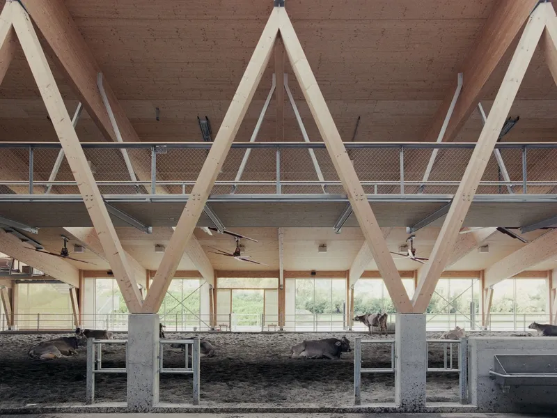 La copertura principale si compone di 52 travi lamellari inclinate sorrette da 52 pilastri tripartiti, con doppi pilastri a V che riducono la sezione e sostengono la passerella, connotando architettonicamente lo spazio. La falda sud include 6 abbaini che introducono luce solare in inverno per mantenere asciutte le lettiere. L’uso di elementi lignei sottili e pilastri e setti in calcestruzzo a vista coniuga leggerezza strutturale, durabilità e manutenzione facilitata.