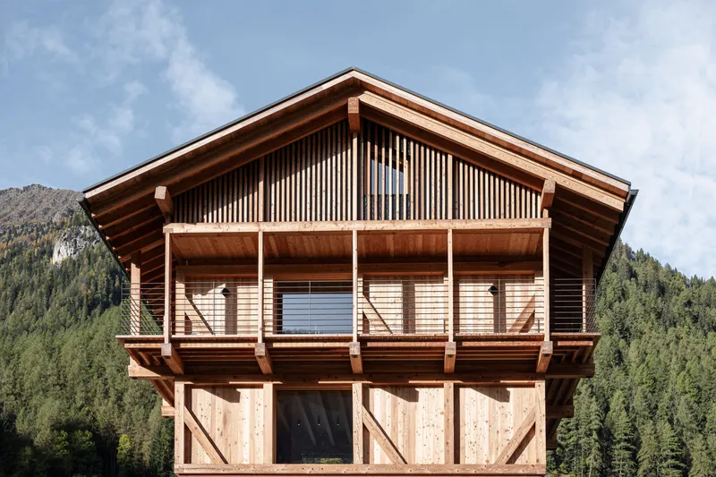 A 1.300 m in Val Gardena, lo studio Mahlknecht Comploi realizza un’abitazione completamente in legno proveniente dal bosco di proprietà, priva di collanti e senza impianto di riscaldamento tradizionale.