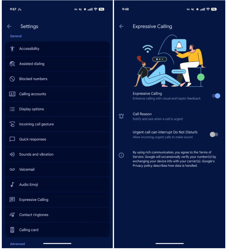 Per verificare se questa nuova opzione è disponibile è sufficiente andare su Impostazioni Telefono ed entrare nella scheda Generali, nella quale in basso dovrebbe esserci la voce Expressive Calling. Nella pagina dedicata, la preferenza di alto livello (che “migliora le chiamate con feedback visivo e tattile”) è abilitata per impostazione predefinita ma gli utenti hanno la possibilità di decidere se attivare o meno l’opzione per consentire alle chiamate urgenti di interrompere la Modalità Non disturbare.