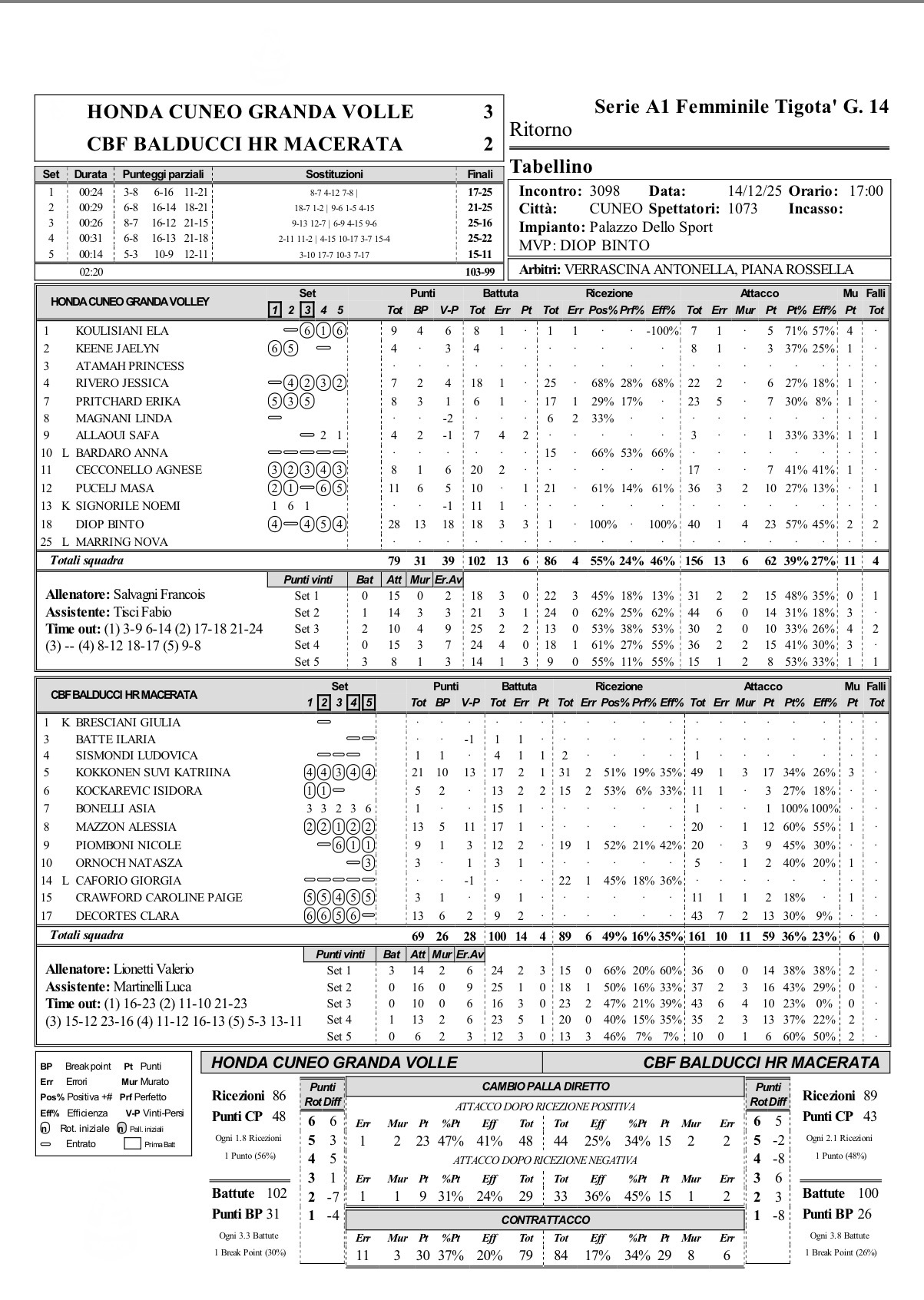 Si lotta anche nell’atto finale: 2-1. Diop inarrestabile beffa Caforio dai nove metri: ace per il 5-3 e time out di coach Lionetti. Cuneo ci crede: 8-5 e cambio campo. Le ospiti accorciano e Salvagni preferisce far rifiatare le sue sul 9-8. Mani out di Kokkonen, 11 pari. Le piemontesi si portano sul 13-11 e la panchina avversaria ferma il gioco. Al rientro, due ace di Diop chiudono il match: 15-11 e 3 a 2. La giocatrice riceve ovviamente il premio mvp a fine partita.