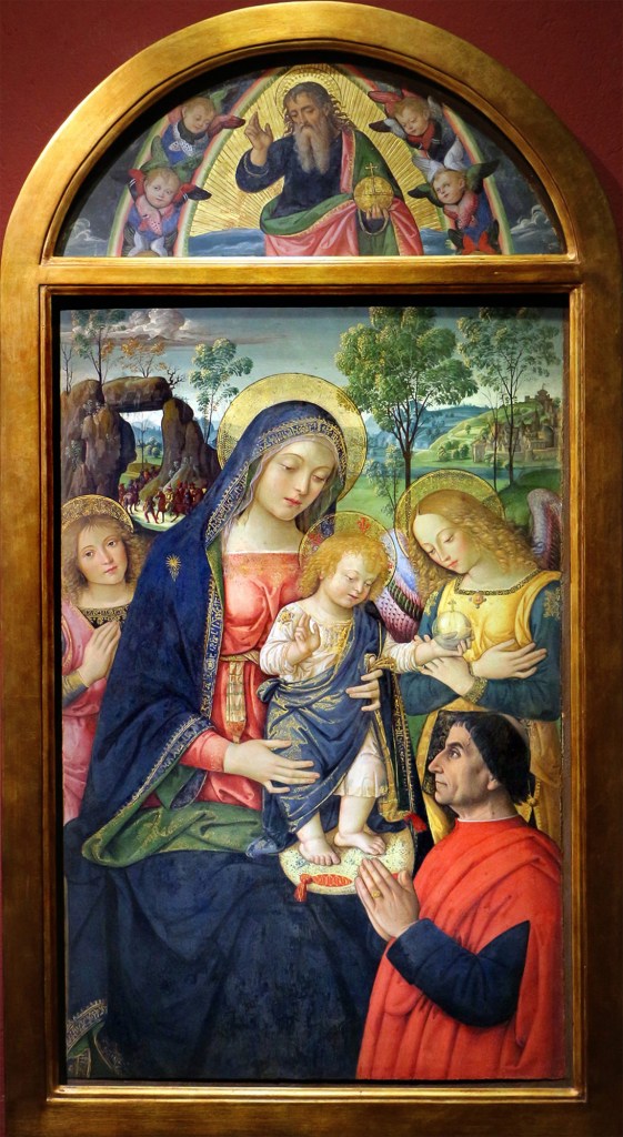 Two angels appear next to the Madonna, while in the foreground is the kneeling patron, recognizable by his realistic and individualized portrait. The background features a serene landscape with a fortified city, an element that reinforces the work’s peaceful meaning.