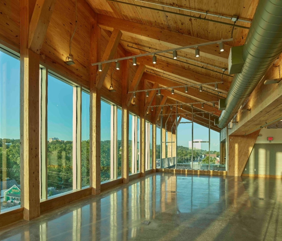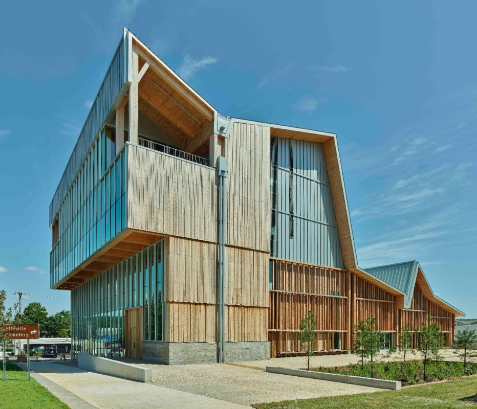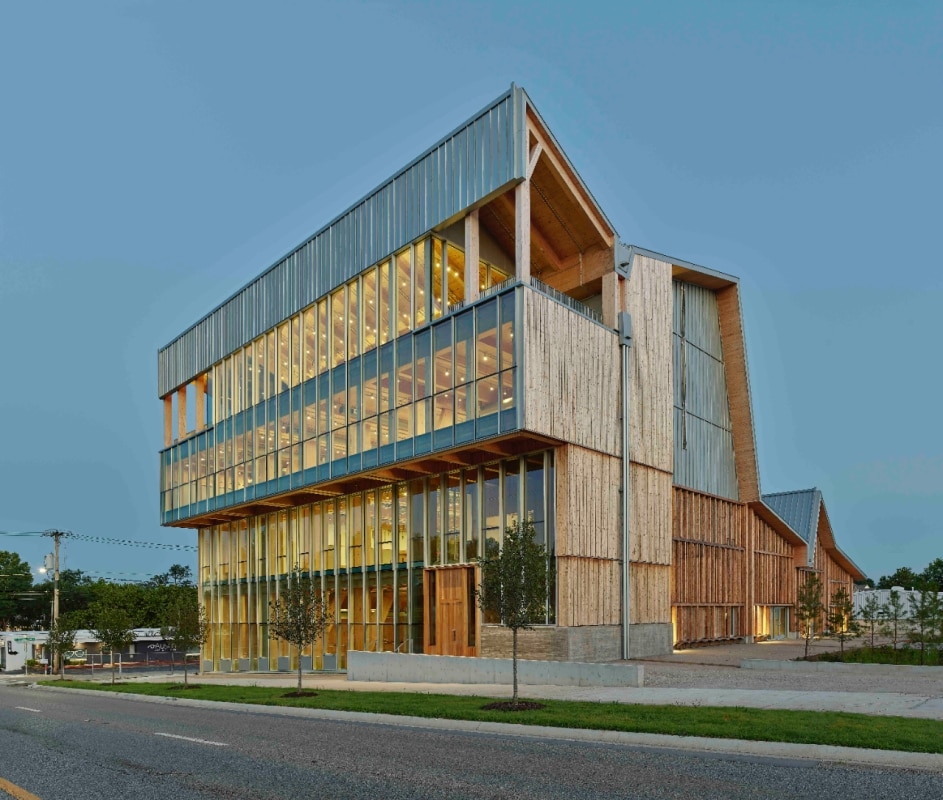 Nel frattempo, il legno entra in modo sistematico anche nelle infrastrutture della conoscenza. Il nuovo Doris Duke Theatre di Mecanoo a Jacob’s Pillow, nel Massachusetts, ricostruisce il teatro distrutto da un incendio con una struttura di massa lignea che integra un apparato tecnico avanzato per la scena contemporanea. A Parigi, lo University of Chicago Center progettato da Studio Gang utilizza un telaio in legno per i piani superiori e rivestimenti lignei di facciata, con elementi prefabbricati provenienti da filiere europee, appoggiati su una piattaforma che scavalca la ferrovia. A Fayetteville, l’Anthony Timberlands Centre di Grafton Architects diventa edificio-scuola sulla costruzione in legno, dove le diverse specie e tecniche sono esposte e rese leggibili come parte del programma didattico. Insieme, questi progetti compongono una mappa di come la cultura del legno stia ridisegnando, con strumenti ancora in evoluzione, il rapporto tra architettura e risorse.