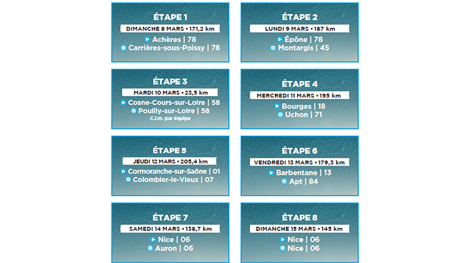 Il gruppo scatterà domenica 8 marzo da Achères, cittadina al suo debutto nella corsa, e arriverà a Nizza, dopo aver superato le consuete sfide: sprint, vento trasversale, cronometro a squadre e salite impegnative. Il percorso subirà delle modifiche durante l’ultimo fine settimana a causa delle elezioni comunali: la Promenade des Anglais ospiterà la partenza della 7a tappa sabato 14 marzo e il vincitore sarà incoronato il giorno successivo allo Stadio Riviera.