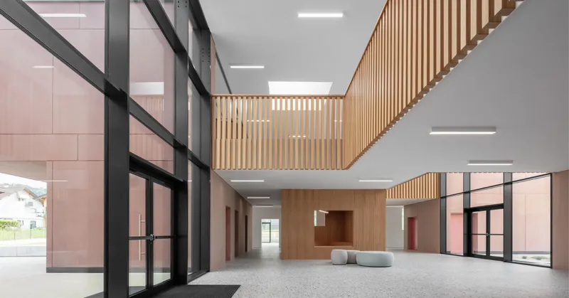 Il progetto si presenta come un edificio orizzontale calato nel paesaggio alpino e riconoscibile per il colore mattone dell’involucro esterno. A questa immagine esterna rigorosa fa da contrappunto la pavimentazione interna in terrazzo seminato, realizzata con lastre in grès porcellanato. La superficie chiara del fondo accoglie scaglie di diverse tonalità di grigio e terra, introducendo una irregolarità controllata che si affianca in modo complementare con la regolarità compositiva dell’architettura complessiva.