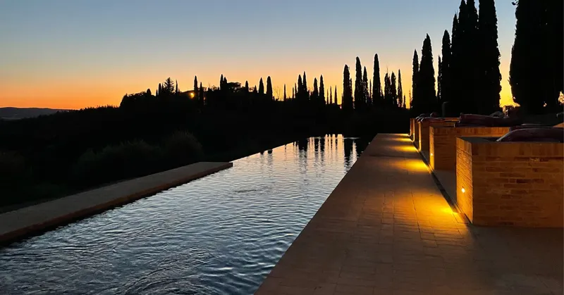 Inserita nel paesaggio delle colline senesi, la piscina è progettata in relazione diretta con l’orografia del terreno, assumendo una configurazione lineare che si legge come una traccia grigio-blu integrata nel contesto del podere. La scelta della soluzione a sfioro rafforza la continuità visiva con l’intorno e valorizza la vista sul paesaggio, che diventa parte integrante dell’impianto progettuale.