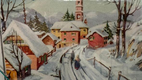 Borghi bomboniera, neve e bimbi sugli sci. Il fascino delle vecchie cartoline di auguri
