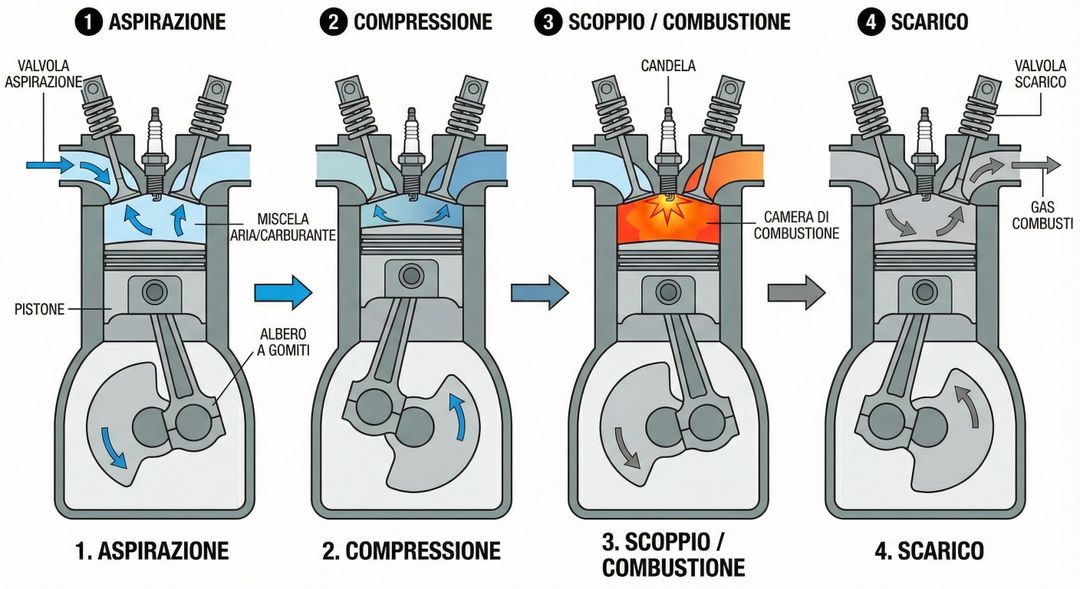 Genera un diagramma tecnico pulito, in stile infografica piatta, che spieghi il flusso base di funzionamento del motore di un’automobile. Aggiungi etichette chiare e leggibili in italiano per ogni componente. Sfondo bianco, estetica ingegneristica.