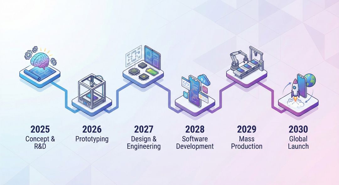 Genera un’infografica di roadmap temporale orizzontale per la progettazione e produzione di uno smartphone. Layout: Linea di progressione lineare da sinistra a destra con 6 nodi milestone. Elementi visivi: Stile vettoriale isometrico, connettori puliti. Ogni milestone include un’icona unica e un’etichetta dell’anno. Palette: Gradazione professionale (da Blu a Viola). Stile vector art ad alta definizione