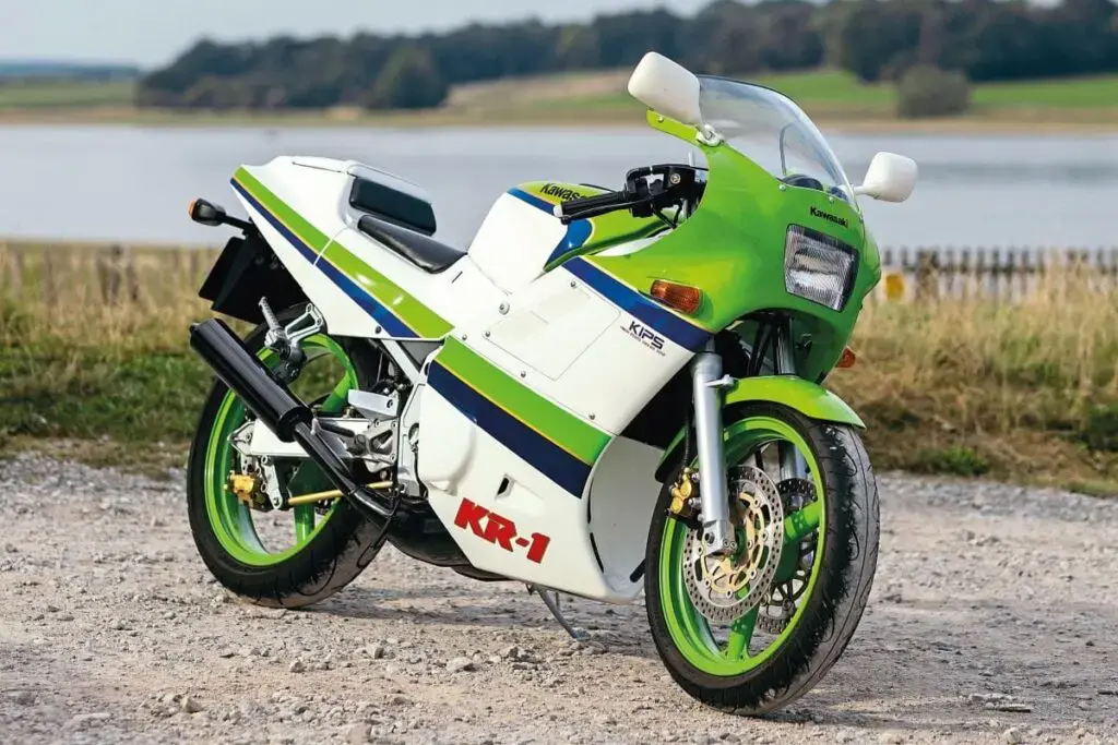 Anche la verdona a 2 tempi è una vera rarità perché la produzione di tutti i modelli (dal 1988 al 1992) è stata inferiore alle 10.000 unità in tutto il mondo. La KR-1 era caratterizzata da una linea molto bilanciata e da prestazioni eccellenti: il telaio in alluminio abbracciava un motore bicilindrico con alesaggio x corsa di 56 mm x 50.6 mm e, grazie ai due carburatori Keihin PWK 28, la potenza arrivava a 52 CV a 10.500 giri/min. Nel 1991, la casa di Akashi presenta le versioni S e R, con quest’ultima valorizzata da due Keihin PWK 35 che garantivano un’incremento di 3 CV, un telaio più rigido e gomme più grandi. Peccato la KR-1 non si sia mai troppo evoluta, infatti anche gli ultimi modelli prodotti montavano dettagli “old style” come la forcella a steli tradizionali.