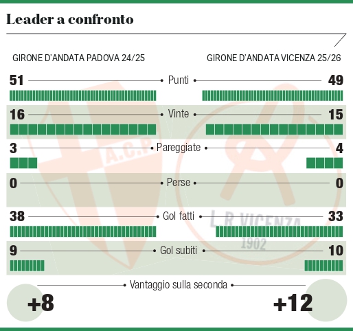 L’avvio del 2026 sarà determinante nel consegnare definitivamente la stagione al Lane o riaprirla. L’anno scorso, il Padova che all’andata era stato devastante (6 vittorie su 6) all’inizio del ritorno ha tirato un po’ il fiato (3 vittorie, 2 pareggi, 1 ko: la prima stagionale giunta sul campo della Virtus al sesto turno). All’inizio del nuovo anno, il Vicenza dovrà superare un paio di ostacoli piuttosto insidiosi come il rivitalizzato Arzignano (terza di ritorno al Dal Molin, 18 gennaio) e la settimana successiva il Cittadella al Menti. Confermare l’imbattibilità nel primo mese metterebbe una seria ipoteca sulla promozione.