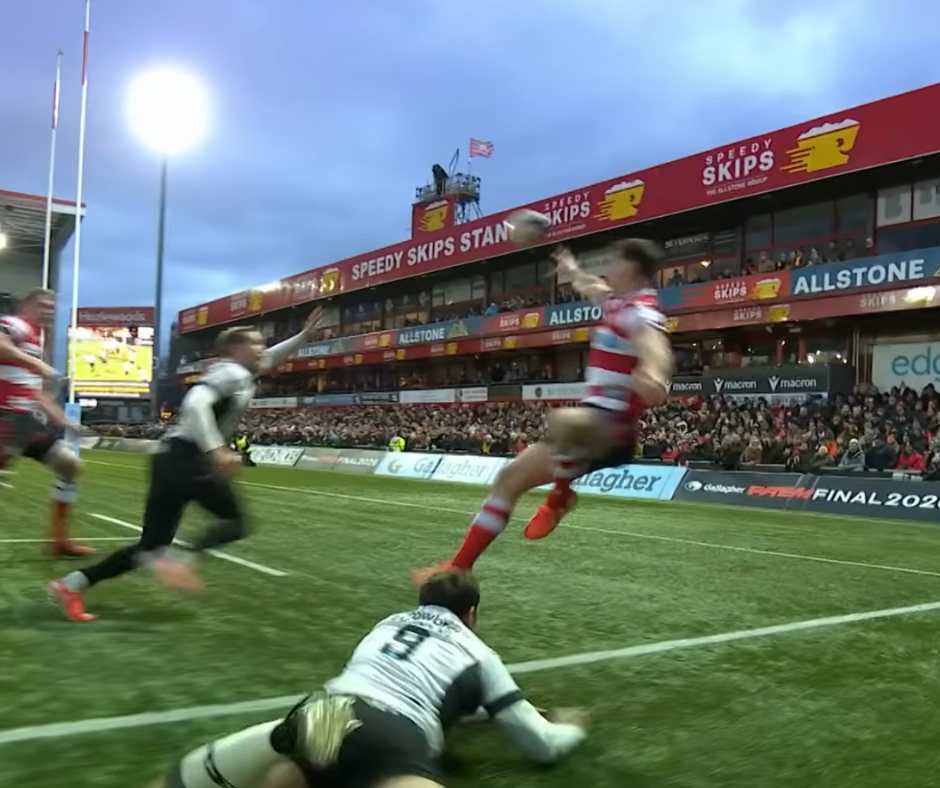 Prima l’attacco sul lato chiuso del campo, poi il gioco di gambe per disorientare la difesa e infine il passaggio spettacolare nella mani di Arthur Clark che deve solo tuffarsi in meta.