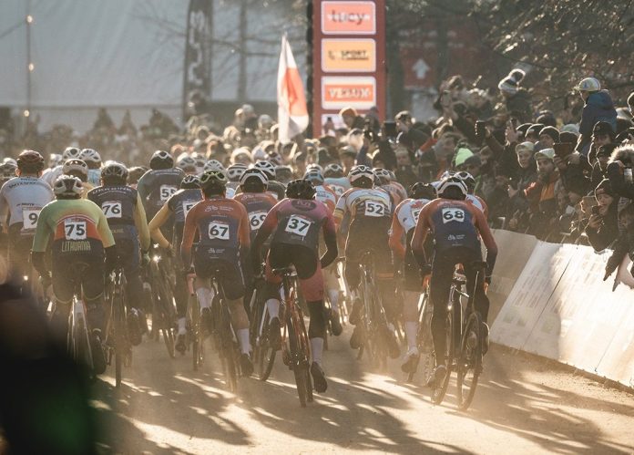 Il gruppo al via della prova di CdM di Dendermonde, che è stata asciutta e non fangosa come lo scorso anno (Foto da X @UCIcyclocrossWC)