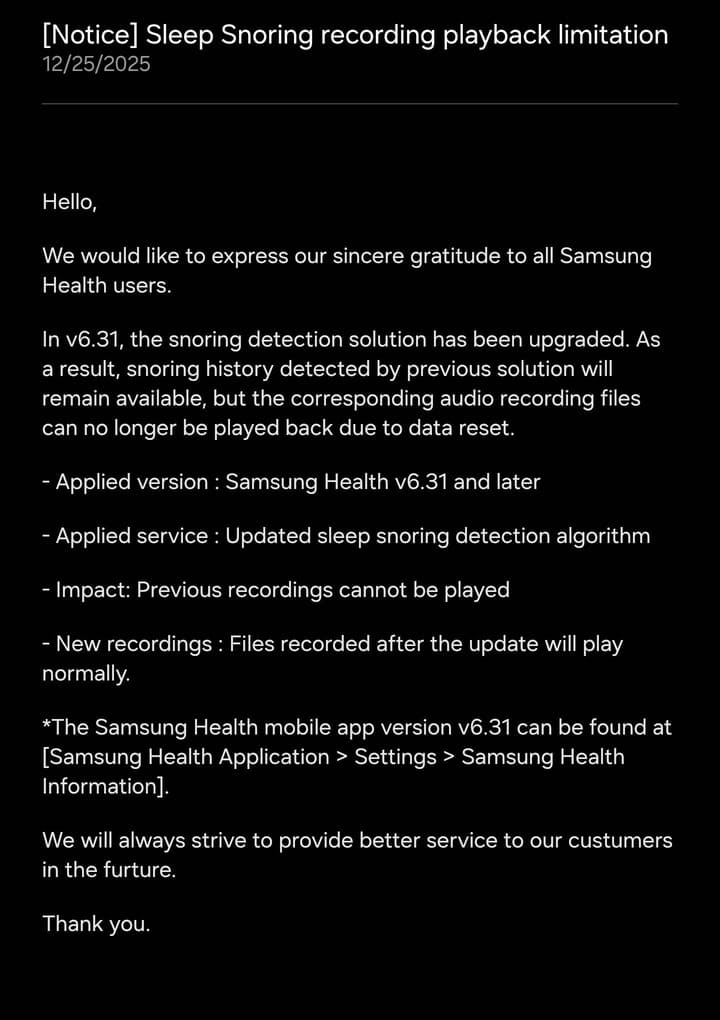 L’aggiornamento Samsung Health 6.31 potenzia il monitoraggio del sonno. La precisione cresce ma i vecchi file audio spariscono dopo il reset dei dati.
