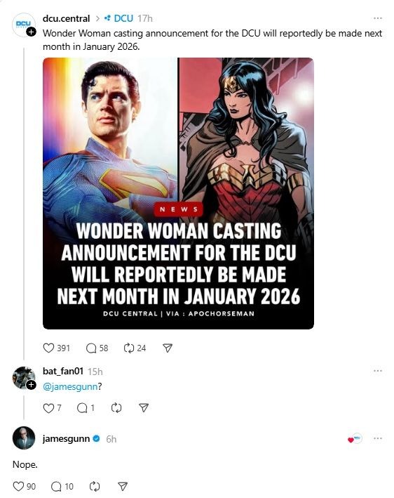 Il DC Universe di James Gunn continua a generare speculazioni e rumor a ritmo serrato. L’ultima voce che ha infiammato la comunità dei fan riguarda una possibile apparizione di Wonder Woman in Man of Tomorrow, il secondo film dedicato al Superman di David Corenswet, previsto nelle sale per il 9 luglio 2027. La risposta del co-CEO di DC Studios è arrivata rapida e secca, ma lascia spazio a qualche interrogativo che vale la pena approfondire. Tutto è partito da un thread su Threads, dove un utente ha chiesto direttamente a Gunn se fosse vero che il casting di Wonder Woman per Man of Tomorrow sarebbe stato annunciato a gennaio 2026. La risposta del regista è stata lapidaria: “Nope”. Una parola sola, inequivocabile all’apparenza, che però potrebbe non chiudere definitivamente la questione.