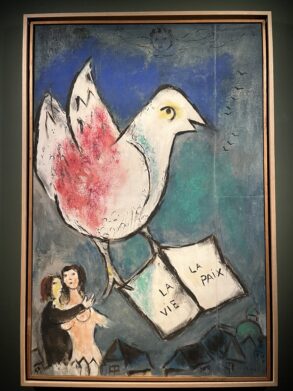 Grato, azzardo per l’ultima volta: «Forse è questa la ragione per cui, nella sala finale della Mostra, possiamo ammirare La Paix? Il quadro raffigura una colomba che porta due libri: La Vie e La Paix. Ti confesso, caro Marc, che l’uomo del mio tempo – lo diceva anche Montale – non sembra aver imparato alcunché dalla vostra lezione. Mai come oggi la pace appare fragile e indifesa, macchiata di sangue, proprio come la tua colomba. Davvero c’è speranza?».