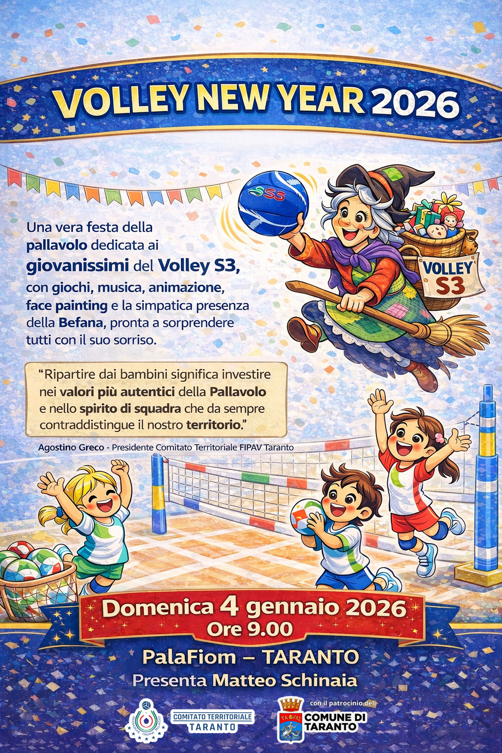 Una vera e propria festa della pallavolo dedicata ai giovanissimi del Volley S3, con giochi, musica, animazione, face painting e la simpatica presenza della Befana, pronta a sorprendere tutti con il suo sorriso. La manifestazione è aperta a tutte le società del territorio e l’invito è stato rivolto in particolare ai piccoli atleti e alle piccole atlete delle categorie S3 White, S3 Green e S3 Red, chiamati a vivere una giornata di sport, entusiasmo e condivisione. A presentare la manifestazione sarà il giornalista e presentatore Matteo Schinaia.