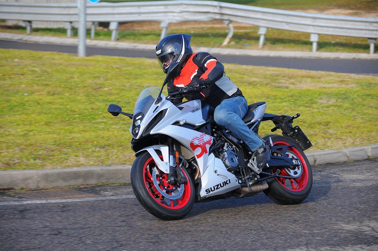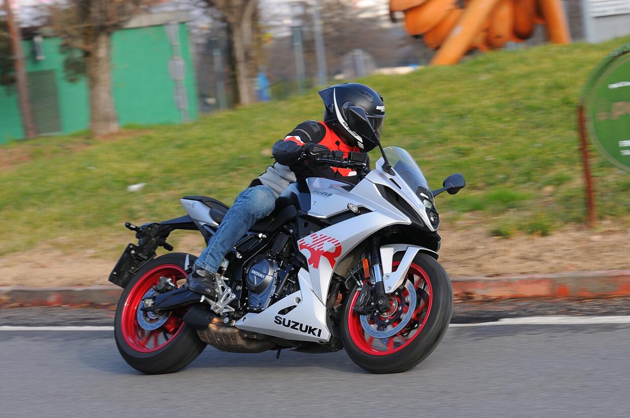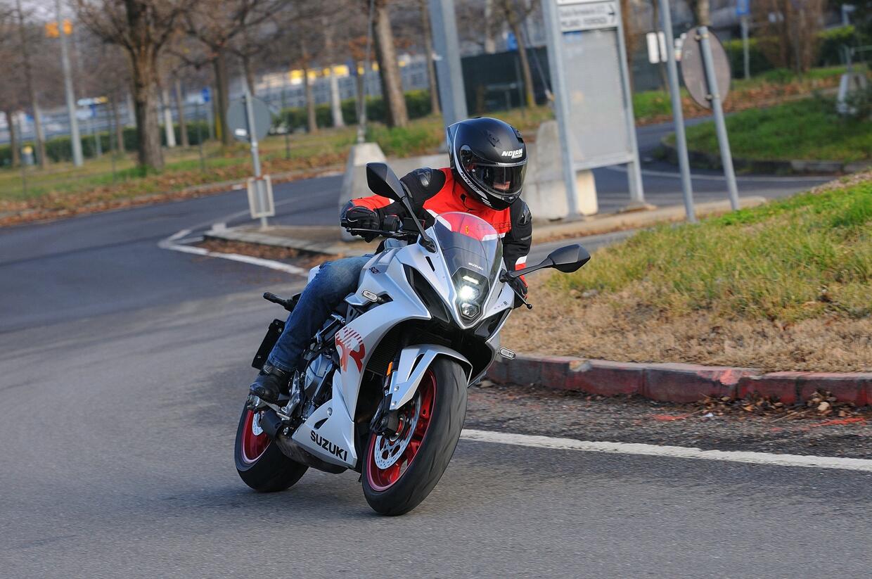 Il cupolino ripara poco, l’assetto è rigido e le buche si sentono. Il bicilindrico Suzuki è pronto e vigoroso ai bassi e medi regimi, ma per trovare la grinta bisogna selezionare la mappa più sportiva (A). I cavalli