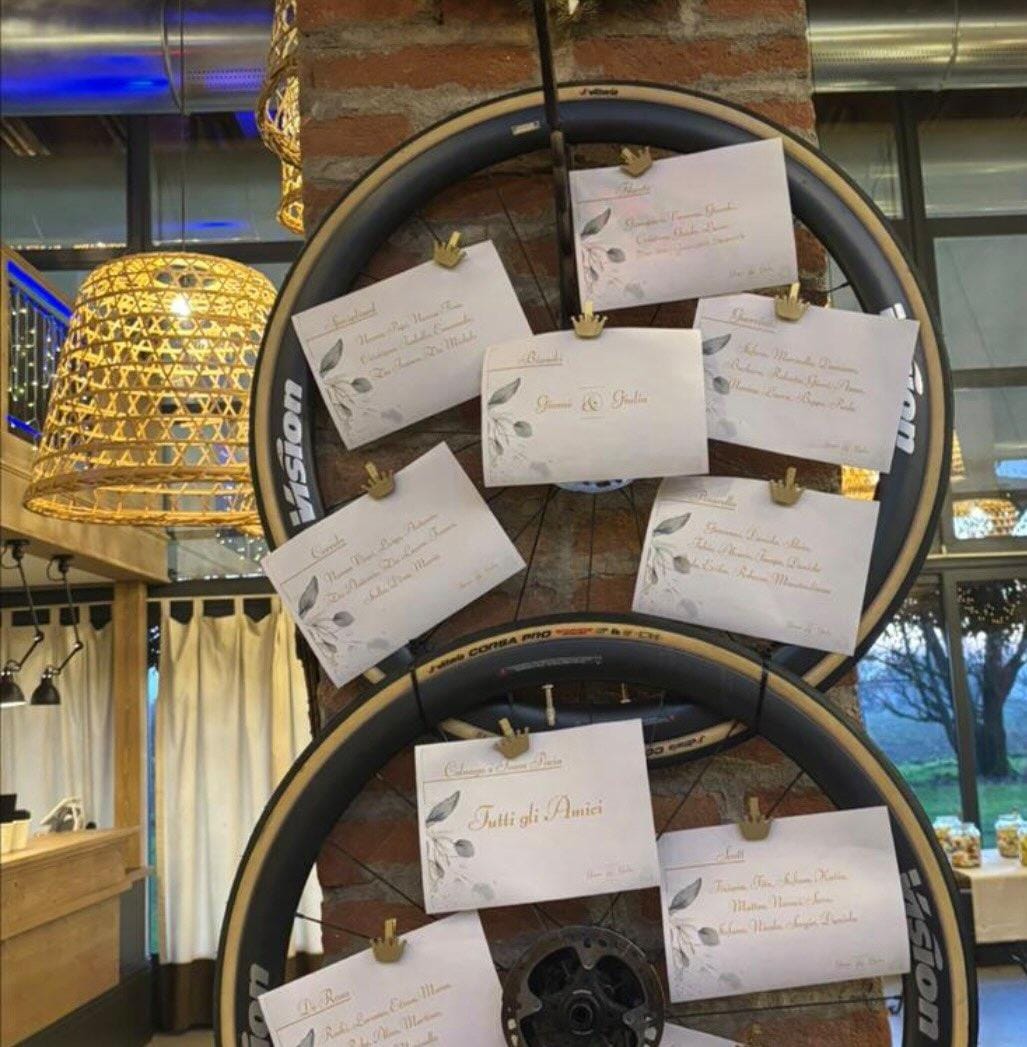 Il tema ciclismo l’ha fatta da padrone: lo sposo è arrivato in chesa con un’ammiraglia, il tableaux de mariage è stato realizzato con i cerchioni delle ruote e ogni tavolo era identificato con il nome di una marca di bici differente. Il tavolo degli sposi? Bianchi.