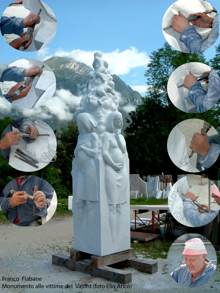 Un dialogo tra arte, memoria e verità emerge dalle fotografie realizzate dal fotografo romano Elio Aricò, dedicate al trittico in marmo di Carrara dello scultore Franco Fiabane, installato nel Cimitero monumentale di Fortogna, frazione di Longarone. L’opera, dedicata alle vittime del Vajont, è una delle più intense testimonianze artistiche della tragedia, scolpita con rigore e devozione da Fiabane, artista-artigiano di rara sensibilità. Fu lo stesso Franco Fiabane, il 24 agosto 2005, ad accompagnare Elio Aricò a Fortogna per mostrargli il monumento completato, dopo che il fotografo lo aveva visto in lavorazione l’anno precedente (vedi raccolta di foto seguenti_2004). Quelle immagini, oltre a documentare con eleganza la potenza del marmo e la profondità del messaggio, assunsero presto un valore speciale per l’artista: “Mi era molto riconoscenti — ricorda Aricò — perché, a suo dire, le fotografie servivano a tacitare le malelingue che cercavano di sminuire il suo lavoro insinuando l’uso del pantografo, la più grave offesa per un vero scultore”. Così, attraverso l’obiettivo di Aricò, il trittico di Fortogna si rivela non solo come monumento alla memoria del Vajont, ma anche come testimonianza di autenticità e orgoglio artigiano, un tributo al valore del fare manuale e alla dedizione di chi, nel marmo, scolpisce anche la propria verità.