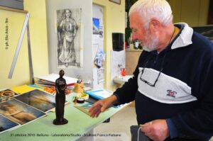 Continua la pubblicazione delle fotografie di Elio Aricò dedicate a Franco Fiabane, scatti del 2010 che raccontano due periodi intensissimi, tra agosto, settembre e il 31 ottobre. Immagini che testimoniano tutta la straordinaria vitalità creativa dell’artista, capace di spaziare dal sacro al profano: dalla lavorazione del monumento alla Beata Gaetana Sterni per Auronzo, ai bassorilievi per il Seminario di Vittorio Veneto, fino alle sculture de “La Baccante” e del volto di donna ispirato a Modigliani. Le foto raccontano anche momenti di amicizia, visite spirituali e la quotidianità nello studio, tra progetti per Luxottica e nuove opere in divenire. Un prezioso viaggio nella memoria artistica di Franco.